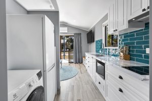 Outside, the front patio is the perfect spot to relax, enhanced by adjustable shade screens for added privacy and security. A small garden shed and clothesline sit at the rear, while an additional awning off the side of the unit provides extra shaded space.