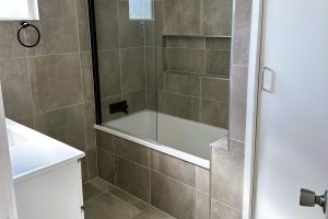 • Upstairs bathroom has been transformed into a shower over bath with floor to ceiling modern tiles