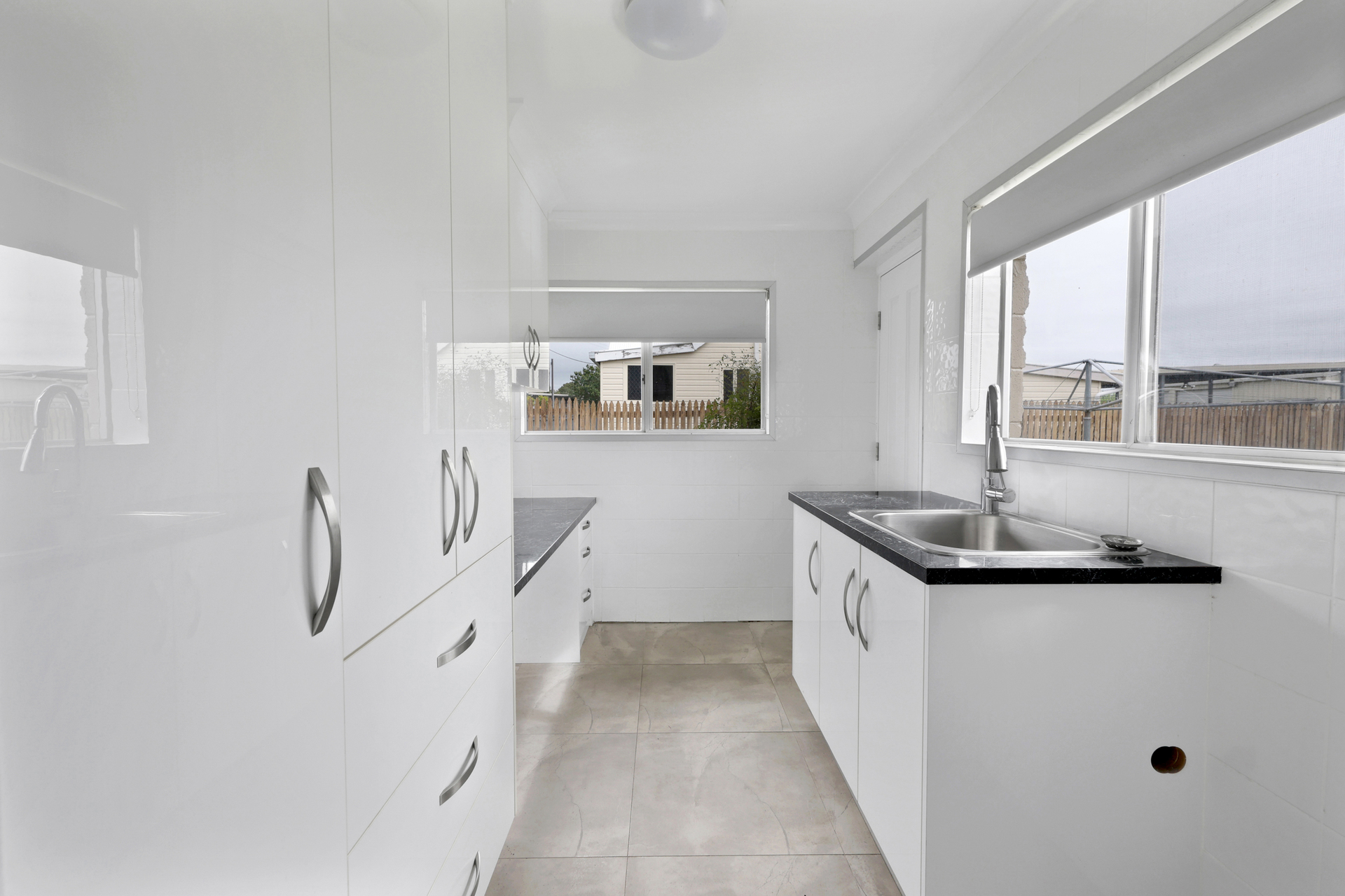 New plumbing installed behind false walls in the laundry, kitchen and bathroom.