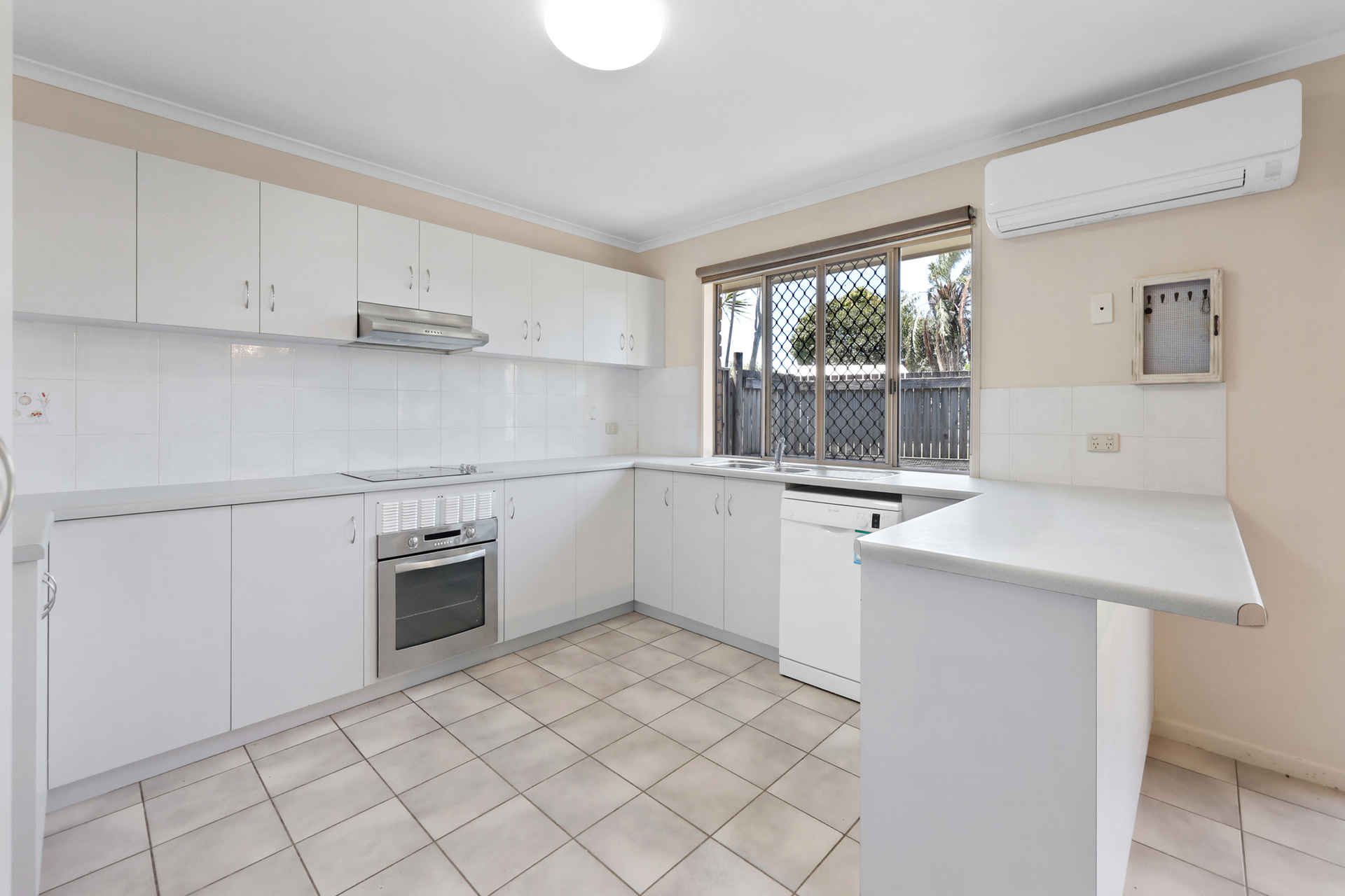 The large kitchen is designed for everyday convenience, featuring a breakfast bar, new Bosch dishwasher, and plenty of cupboard and bench space. The dining area sits opposite the kitchen, creating a functional flow for family living.