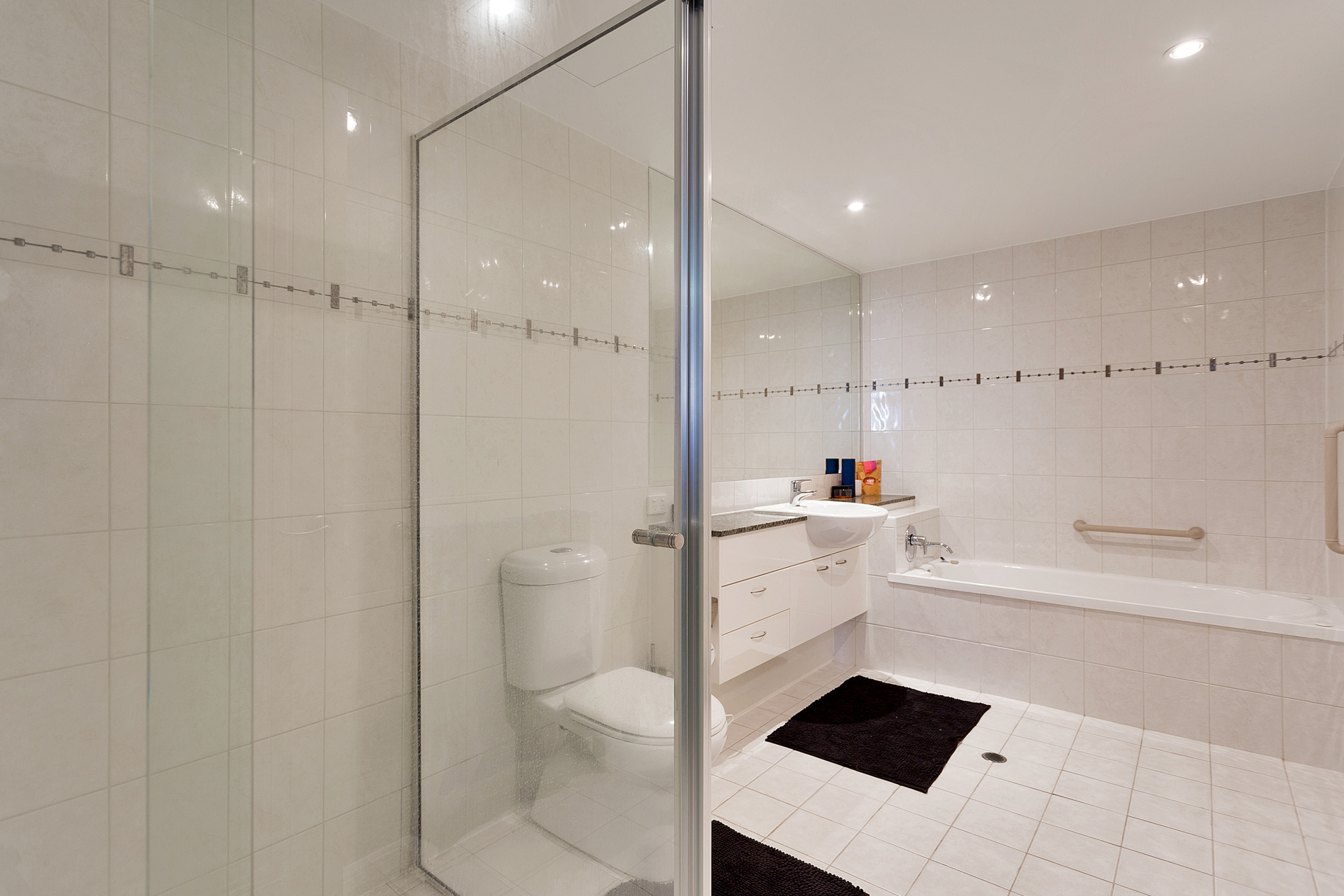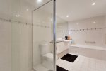 – Large bathroom with shower, vanity, and spa bath.