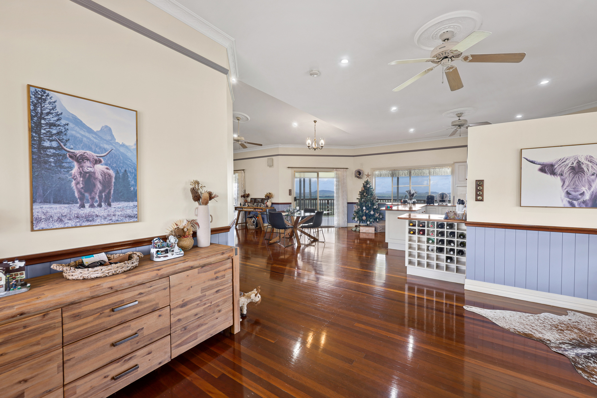 • Open-plan kitchen, lounge, and dining area with polished timber floors